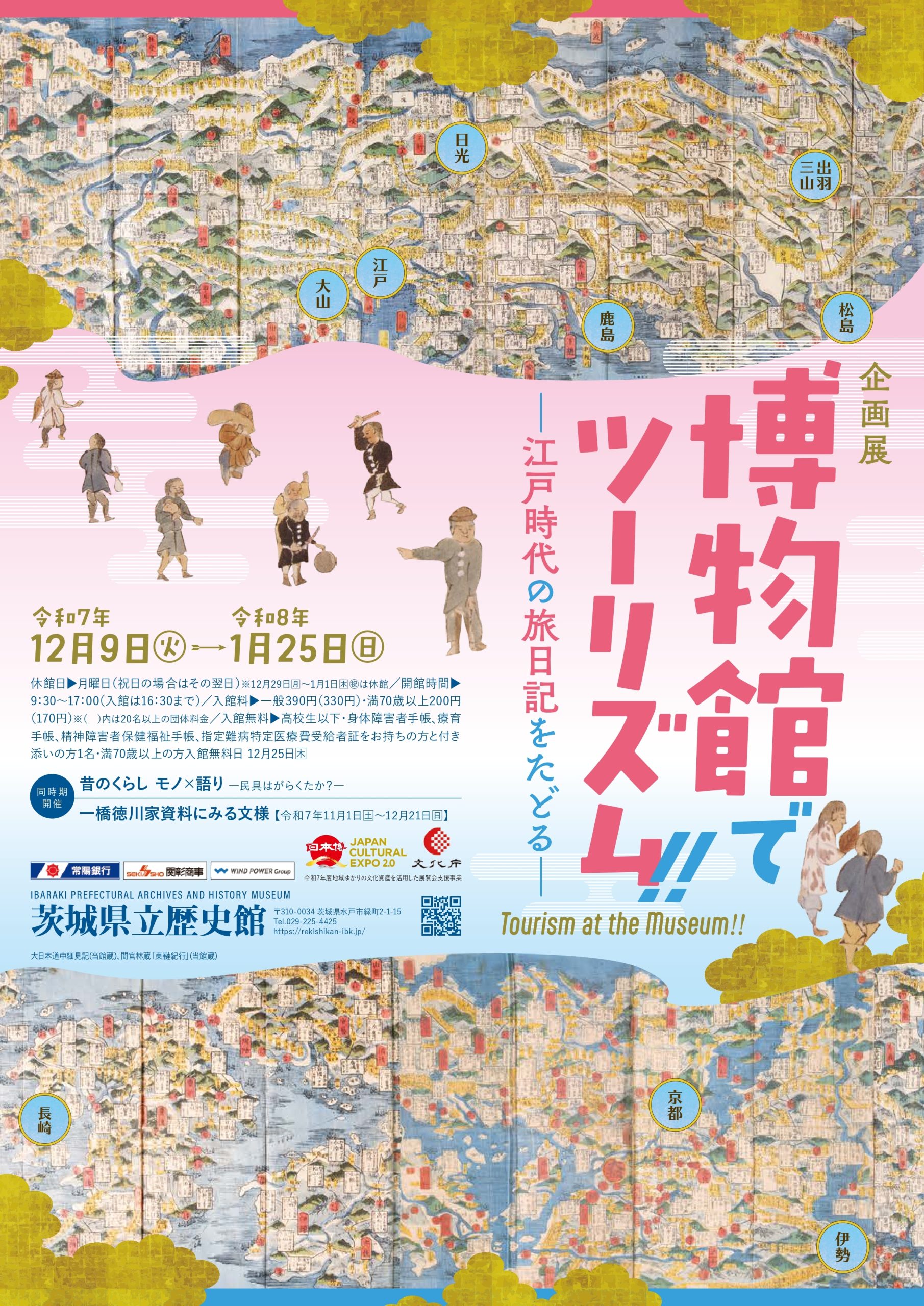 チラシPDFはこちら 会期|令和7年12月9日(火)~令和8年1月25日(日) 旅が大衆化した江戸時代、現在の茨城県域からも多くの人々が日本各地に旅立ち、また当地にも多くの旅人が訪れました。その目的は、寺社参詣、名所旧 … 続きを読む 博物館でツーリズム!! —江戸時代の旅日記をたどる―